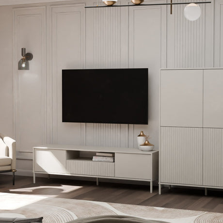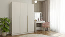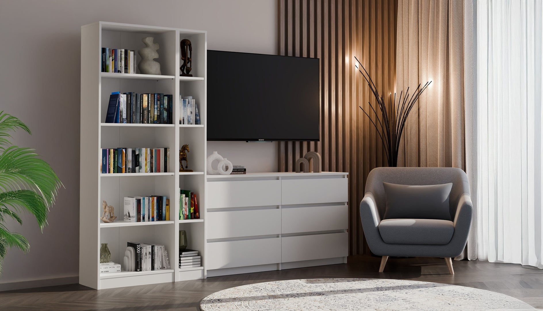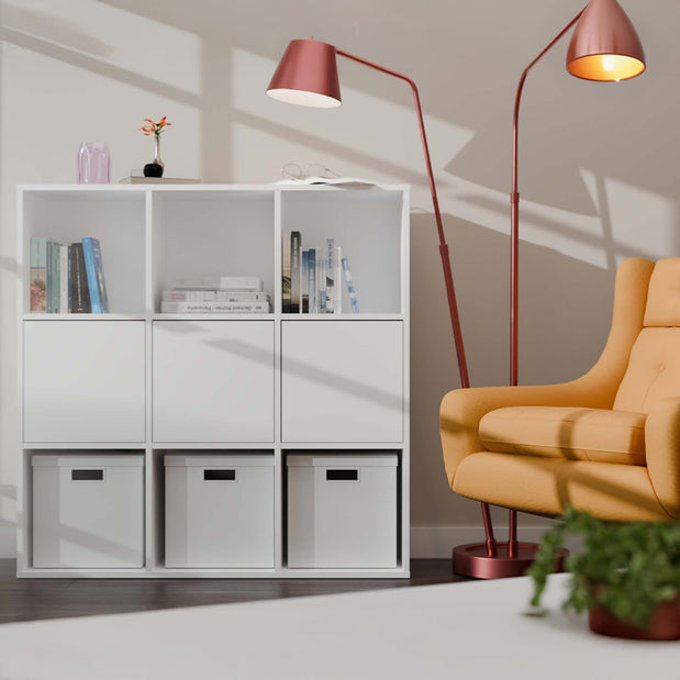 Zintegrowany regał wyposażono w część zamykaną drzwiami, za którymi znajdują się trzy pojemne półki, a także w szufladę oraz półki otwarte, dzięki czemu z łatwością posegregujesz wszystkie potrzebne rzeczy – od książek i dokumentów po drobiazgi.